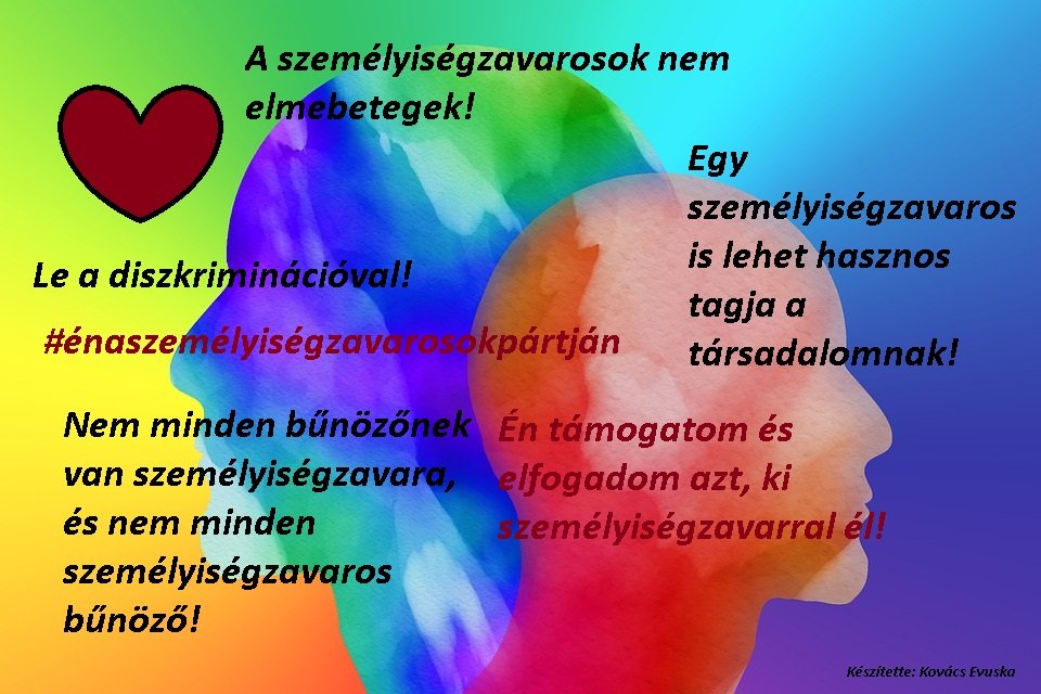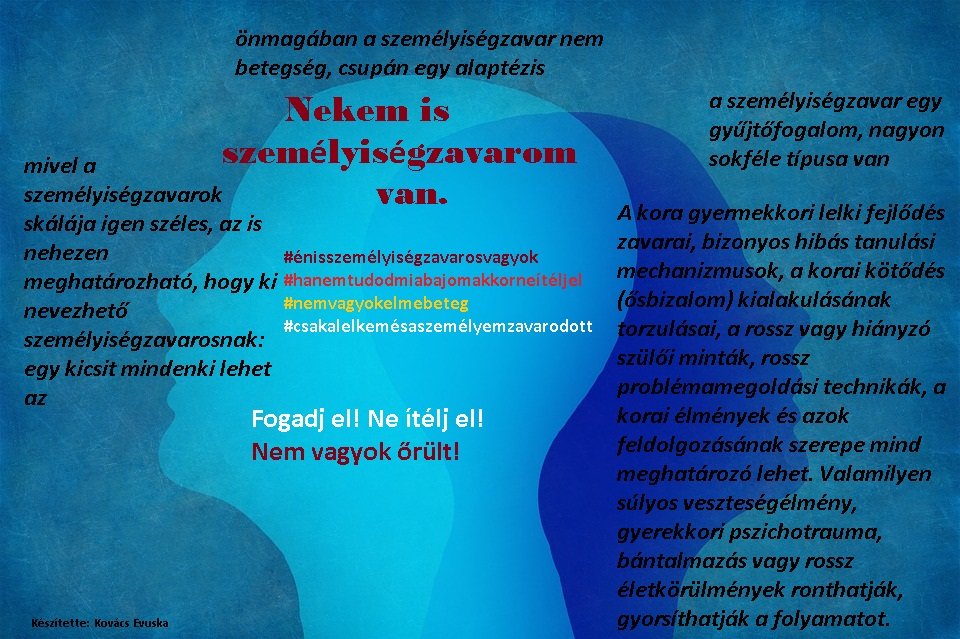 Azt nem szeretném, hogy bárkivel ilyen előfordulhasson, akinek ilyen “betegsége” van. Ezért akarom, minél több embernek megmutatni a személyiségzavar igazi oldalát. Ennek okán, letölthető és megosztható plakátokat hoztam létre, amik a Kovács Evuska Írásai nevű Facebookos oldalamon is megtalálhatók és oszthatók. Két típusú kép van. Az egyik azoknak szól, akik vállalják hogy ezzel a problémával élnek, a másik pedig olyanokat szólít meg, akik támogatni szeretnének olyan embereket, akik személyiségzavarral küzdenek.